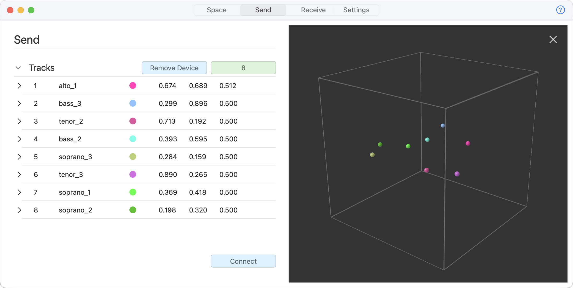 Stream object-based audio into a Space for live performances in virtual Spaces.