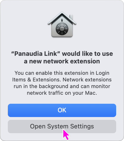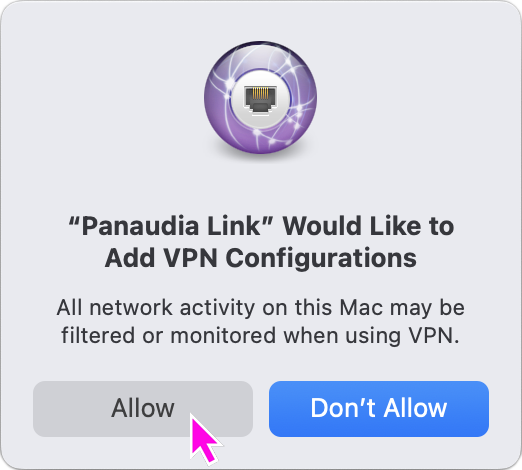 When you first click "Connect" in Panaudia Link, to connect to a Space, the Network Extension will try to create a new VPN. You will see a system alert like this. Click "Allow" to let the app create a new VPN.