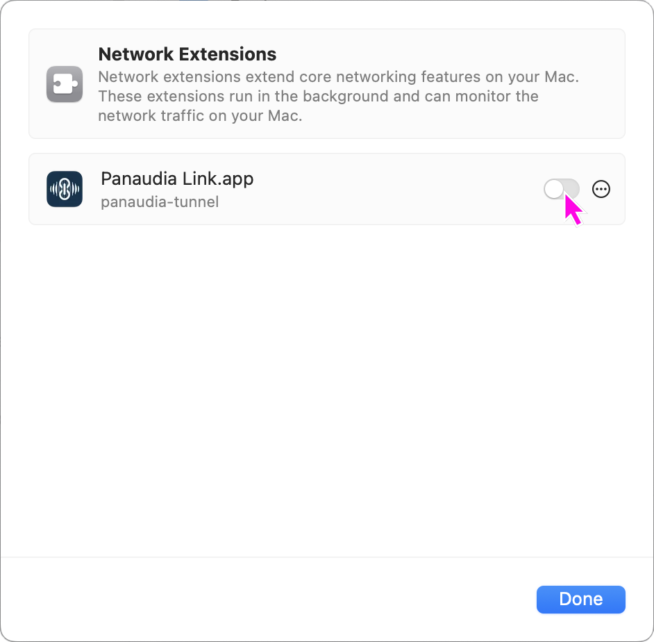 When you first run Panaudia Link it will install a Network Extension called panaudia-tunnel which manages our VPNs.