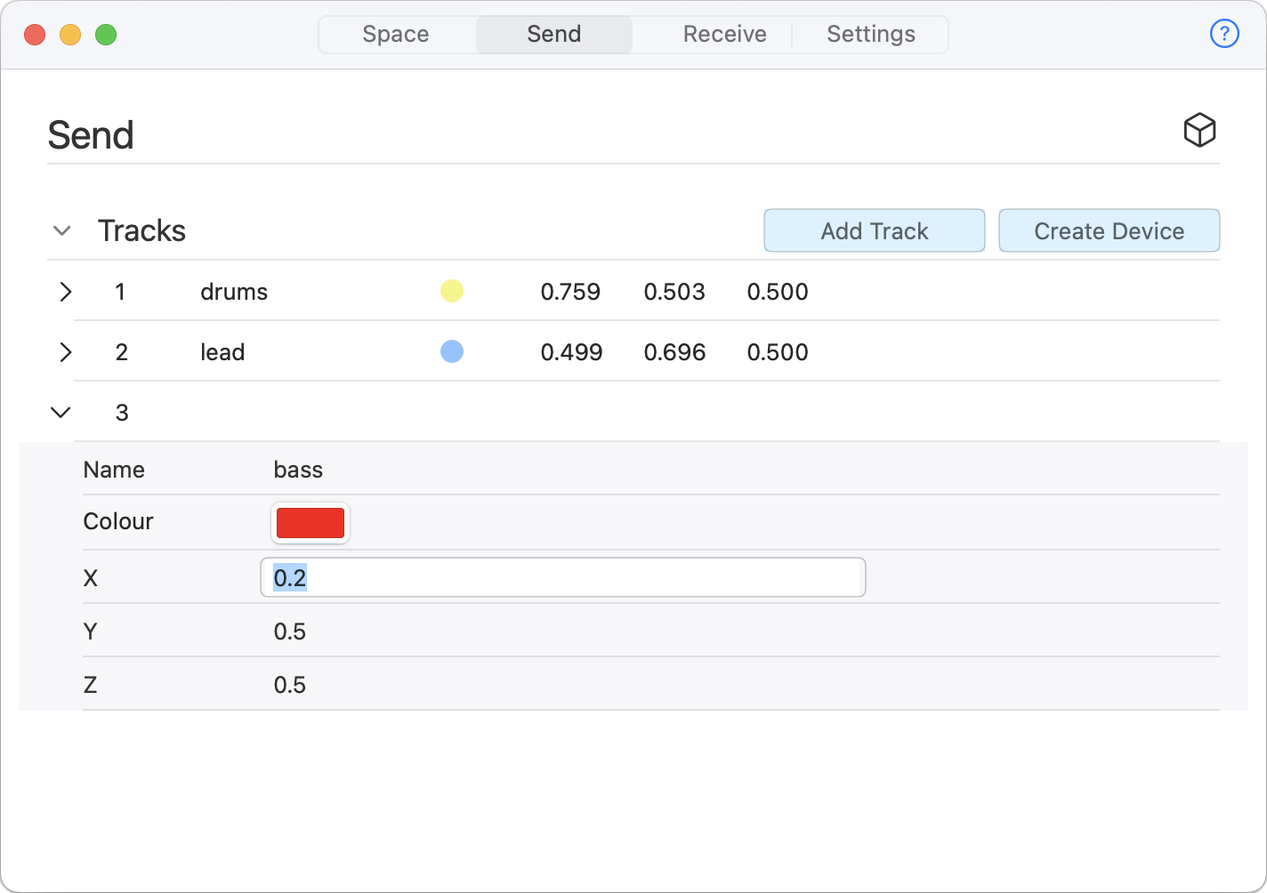 You can control the Position of each track in the virtual Space manually in Panaudia Link or by sending it OSC messages. Position values are normalised in the range 0 -> 1. You can read all about the coordinate system we use here.